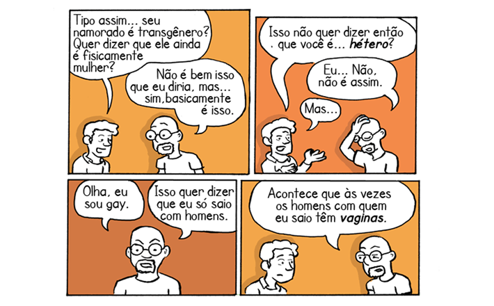 “Eu sou saio com homens. Acontece que às vezes os homens com quem eu saio têm vaginas“. Se essa declaração te deixa confuso, está na hora de desconstruir alguns pré-conceitos que você ainda tem sobre a sexualidade humana. O cartunista Bill Roundy, cansado de dar explicações para a “patrulha da sexualidade” sobre seus relacionamentos com homens trans, resolveu explicar, através de quadrinhos, como é namorar um.