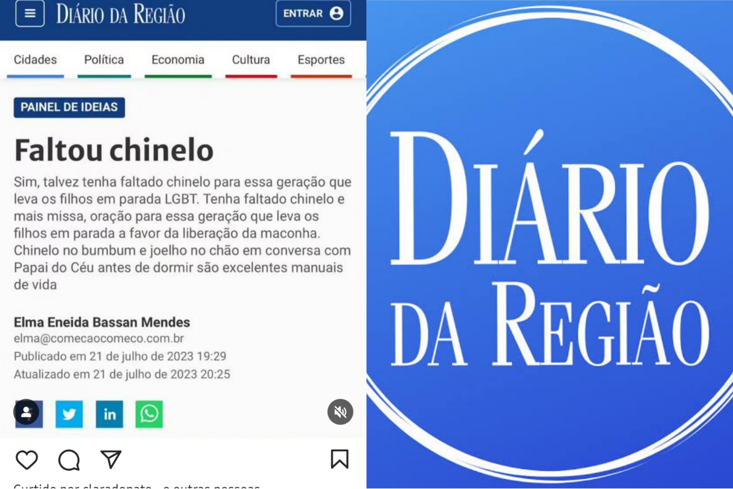 Na matéria já apagada do portal, a jornalista Elma Eneida Bassan Mendes, diz: “Sim, talvez tenha faltado chinelo para essa geração que leva os filhos em Parada LGBT. Tenha faltado chinelo e mais missa, oração pra essa geração que leva os filhos em para em favor da liberação da maconha. Chinelo no bumbum e joelho no chão em conversa com o papai do céu antes de dormir são excelentes manuais de vida”.