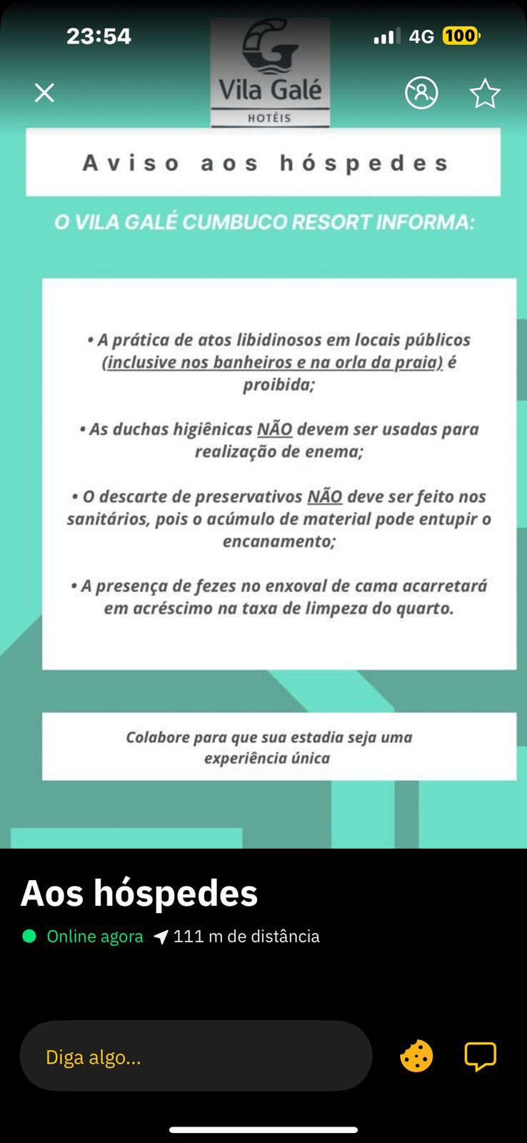 Segundo prints que viralizaram nas redes sociais, o Vila Galé teria criado um perfil no Grindr com o nome “Aos hóspedes”, para divulgar orientações sobre comportamento e limpeza durante a estadia. O banner do perfil trazia recomendações como a proibição de atos libidinosos em locais públicos, o uso indevido das duchas higiênicas, o descarte incorreto de preservativos e até um alerta sobre taxas extras em casos de “presença de fezes no enxoval de cama”. A mensagem terminava com o pedido: “Colabore para que sua estadia seja uma experiência única”.