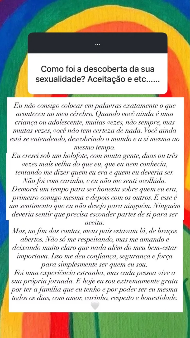 Em um desabafo publicado nos stories, Camilly contou que o caminho até se declarar publicamente quem é foi atravessado por inseguranças e pressões externas. “Quando você ainda é uma criança ou adolescente, ainda está se entendendo, descobrindo o mundo e a si mesma ao mesmo tempo. Eu cresci sob um holofote, com muita gente, duas ou três vezes mais velha do que eu, que eu nem conhecia, tentando me dizer quem eu era e quem eu deveria ser. Não foi com carinho, e não me senti acolhida”, escreveu. Segundo ela, o excesso de opiniões e julgamentos dificultou um processo que já costuma ser delicado por si só.